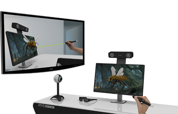 RTS-3DESK是全息3D智能立體交互系統(tǒng)應(yīng)用于桌面型3D交互的一種產(chǎn)品形態(tài),主要是基于RTS-DINO雙目紅外光學(xué)相機(jī)系統(tǒng)來實(shí)現(xiàn)三維定位,通過輕量級的交互筆對全息3D場景內(nèi)容實(shí)時(shí)操控,將3D顯示載體用桌面式3D顯示設(shè)備呈現(xiàn),從而構(gòu)建出一套可交互的桌面式全息3D顯示系統(tǒng)。