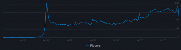 VRChat是一款VR社交應(yīng)用,其支持VR和非VR用戶之間進(jìn)行聊天及共同探索游戲社區(qū)。早在2018年,這款應(yīng)用就引起大量社交群體的關(guān)注,并在短短一個月時間內(nèi)就實(shí)現(xiàn)了用戶數(shù)量的激增,在Steam平臺上的同時在線用戶峰值達(dá)到了20000人。盡管這一峰值很快消退,但其用戶留存依然驚人,自此之后,其用戶基數(shù)便不斷增長。