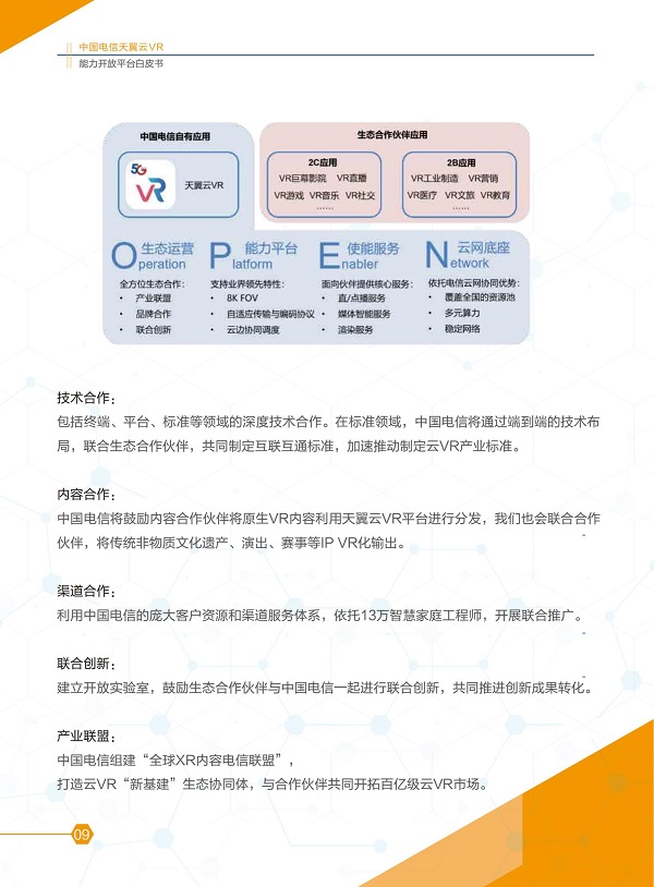 本白皮書介紹了當前云VR產業(yè)發(fā)展趨勢、相關技術和使用便捷、低成本、高效益的特點,從生態(tài)運營、能力平臺、使能服務、云網(wǎng)底座四個方面闡述了天翼云VR 能力開放平臺的關鍵技術以及面向合作伙伴提供的系統(tǒng)化服務,并探討了商業(yè)模式典型應用場景和相關案例。
