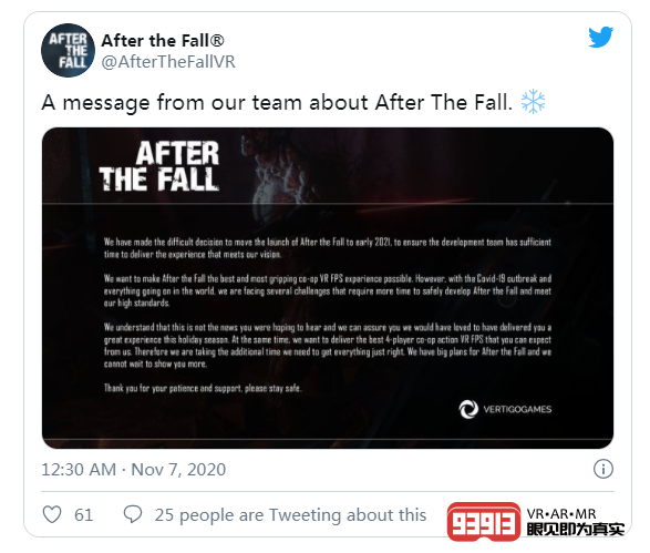 Vertigo Games在其官方Twitter賬號上宣布了這一消息,并表示:“我們做出了一個(gè)艱難的決定,將《After the Fall》的發(fā)布時(shí)間推遲到2021年初,以確保開發(fā)團(tuán)隊(duì)有足夠的時(shí)間來完善游戲內(nèi)容。”與目前許多需要適應(yīng)偏遠(yuǎn)工作環(huán)境的工作室一樣,該團(tuán)隊(duì)將新冠病毒疫情視為導(dǎo)致該作發(fā)布延期的主要原因。
