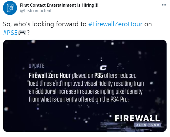 根據(jù)該推文所透露的信息,PS5版《Firewall Zero Hour》減少了游戲加載時間及提高了游戲畫面保真度,其與同在PS4 Pro上運行的版本相比,該版本進一步增加了超采樣像素密度。