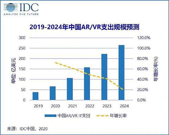 據(jù)《IDC全球增強(qiáng)與虛擬現(xiàn)實(shí)支出指南2020》預(yù)計(jì),2020年中國市場在 AR/VR相關(guān)產(chǎn)品和服務(wù)的支出較疫情前顯著增加,總體市場規(guī)模將于 2020年底達(dá)到66億美元左右,較 2019年同比增長 72.1%——憑借這一成績,國內(nèi)AR/VR產(chǎn)業(yè)全球占比將達(dá)到55%、72.1%的增幅也超過美國市場位列全球主要市場首位,同時(shí)據(jù)IDC預(yù)測,未來 5年(2020-2024)國內(nèi) AR/VR產(chǎn)業(yè)平均增長率可達(dá)到47.1%的水平,這基本預(yù)示著國內(nèi)市場將持續(xù)保持AR/VR產(chǎn)業(yè)的“全球第一大規(guī)模”。