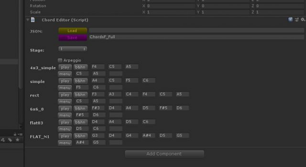 在Unity 3D中,我制作了一個(gè)簡(jiǎn)單的編輯工具,讓我能夠輕松的改變每個(gè)謎題所附帶的音符,同時(shí)還能夠?qū)⑦@些音符儲(chǔ)存在獨(dú)立的文件中。如此一來我就可以為游戲同時(shí)測(cè)試多首歌曲,也讓游戲不斷迭代過程中保持音符和謎題的關(guān)聯(lián)變得更加容易。