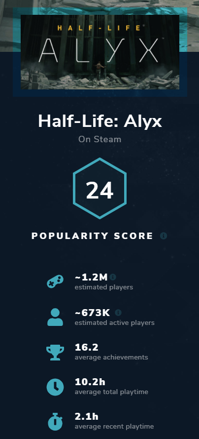 其次,根據(jù)PlayTracker的估算數(shù)據(jù),「半衰期:愛莉克斯」的玩家數(shù)量約為120萬人,活躍用戶67.3萬人,雖然相比去年的大獎得主「只狼:影逝二度」同期超過380萬的銷量要低上不少,但考慮到「半衰期:愛莉克斯」的入門門檻以及Steam VR獨占的原因,這樣的銷量成績已然足夠優(yōu)秀。