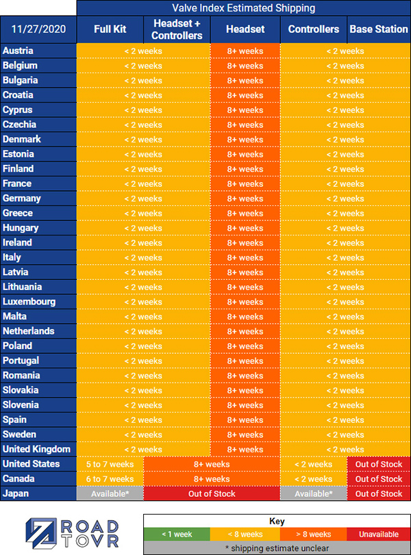 不過,RoadtoVR在11月底的一份調(diào)研數(shù)據(jù)顯示,除單獨頭顯之外,Index在絕大部分發(fā)售國家和地區(qū)的出貨時間已縮短到2周以內(nèi),基本擺脫因新冠疫情導致的供應能力不足問題。所以,Index后續(xù)在消費級市場的表現(xiàn)還是值得期待的。