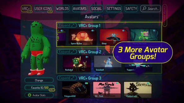 成為VRChat Plus會員,用戶將能自定義用戶圖標以打造個性化VRC銘牌,該高能功能支持用戶保存64個自定義圖標以及進行分享交換。此外,會員用戶還擁有100個頭像保存空間(免費用戶僅25個),以供用戶隨時展示及收藏喜愛的個性化頭像。
