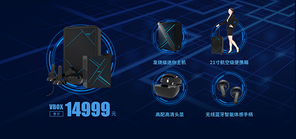 VBOX由迷你主機、21寸航空級便攜箱、高清高配頭顯以及無線藍牙智能體感手柄組成。便攜行李箱可容納主機、頭顯以及手柄,是移動便攜的最佳“黑科技”產(chǎn)品。
