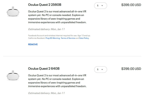 至發(fā)稿時(shí),F(xiàn)acebook官方網(wǎng)站顯示,Quest 2 64GB(299美元)和256GB(399美元)的新訂單均需要等待2021年1月份才能發(fā)貨。