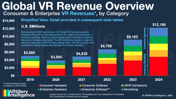 根據(jù)ARtillery Intelligence近日發(fā)布的一份報告,該機(jī)構(gòu)預(yù)計全球VR市場的收入將從2019年49.8億美元增長到2024年121.9億美元,復(fù)合年增長率為19.6%。其中僅2020年份,全球VR消費市場的營收將達(dá)到27億美元,而企業(yè)市場營收則相對落后,預(yù)計僅11.85億美元,隨著VR消費市場主要是游戲市場的進(jìn)一步增長,VR將有望在娛樂和通信領(lǐng)域開拓更廣泛的市場。