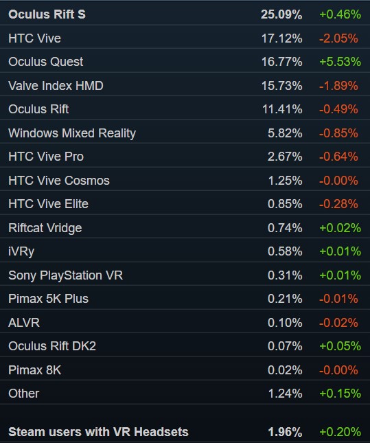 不過,11月Steam硬件和軟件調(diào)查報(bào)告顯示,Valve Index的用戶份額竟然降到了 15.73%(-1.89%),已經(jīng)被Oculus Quest(16.77%)所超越。不出意外的話,12月份Steam硬件和軟件調(diào)查報(bào)告本周就將發(fā)布,屆時(shí)我們將在第一時(shí)間為大家解讀。