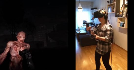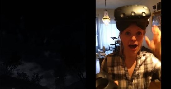 很快,在游戲畫面中,出現(xiàn)了一個僵尸,在漆黑一團(tuán)的環(huán)境中突如其來的僵尸的確很嚇人!這位叫Renate的妹子看來在玩這款HTC Vive平臺的第一人稱射擊&恐怖游戲《The Brookhaven Experiment》時沒有做好心理準(zhǔn)備,看她見到僵尸的一瞬間,整個人都不好了。