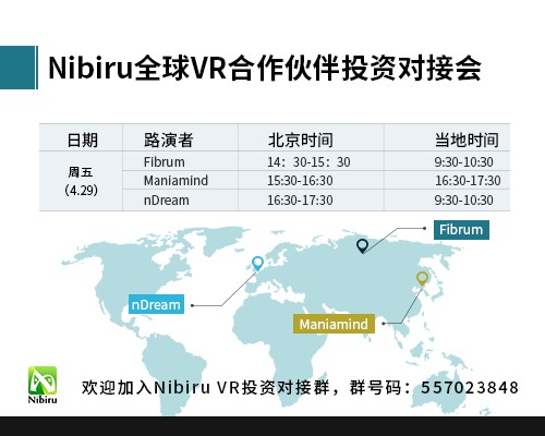 16:30-17:30 nDream 英國(guó)著名移動(dòng)VR游戲開發(fā)商,其高端VR內(nèi)容開發(fā)商的地位為業(yè)內(nèi)熟知,Sony、Oculus、Google、Microsoft與其都是長(zhǎng)期合作伙伴關(guān)系。是Gear VR十大首發(fā)游戲《Gunner》的開發(fā)商,另一款移動(dòng)VR游戲《Perfect Beach》多次躋身Google Cardboard榜首,在Gear VR商店平均排名前五。2016年計(jì)劃8款高端VR內(nèi)容上線,年度盈利預(yù)期為400萬美金,明年可以突破1200萬美金。 本次活動(dòng)將以QQ在線路演的方式進(jìn)行,在30分鐘的路演環(huán)節(jié)之后,每家公司將有30分鐘的線上洽談時(shí)間。Nibiru VR投資對(duì)接群群號(hào)為557023848。 后續(xù),Verest 360 VR, Macro IR Presentation, Muse Works, Gatto Studios, Wide Vision, Metal Rabbit Games, Absologix, Coal Car Studios, 3D Sound Lab等海外公司將參與到Nibiru全球VR合作伙伴投資對(duì)接會(huì)的活動(dòng)中去,相關(guān)的線下活動(dòng)也會(huì)同步開啟。