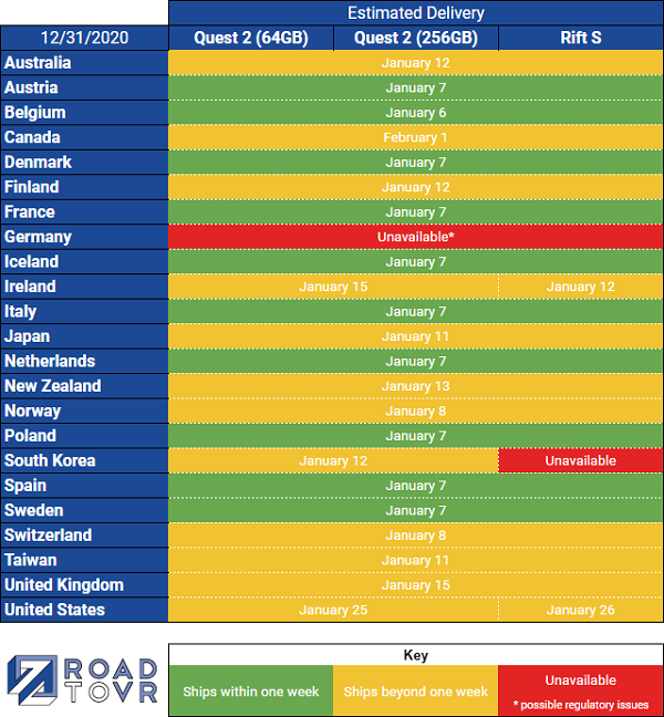 此外RoadtoVR公布了官方數(shù)據(jù)的Quest 2 64GB/256GB及Rift S頭顯在各國(guó)的發(fā)貨時(shí)間,最新時(shí)間表顯示大部分國(guó)家和地區(qū)都能在一到兩周內(nèi)發(fā)貨,但是美國(guó)和加拿大地區(qū)的Quest 2訂單卻大量滯銷,預(yù)計(jì)要等到1月下旬或2月初才能交付。