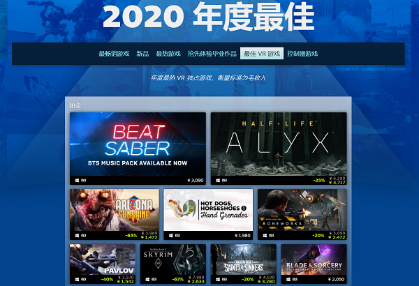V社近日公布根據(jù)游戲總收入進行排名的Steam 2020年度最佳VR游戲榜單,「半衰期:愛莉克斯」榮登該榜單鉑金游戲榜;同時「半衰期:愛莉克斯」也是唯一入圍Steam 2020年度最暢銷游戲Top 100榜單的VR獨占游戲。