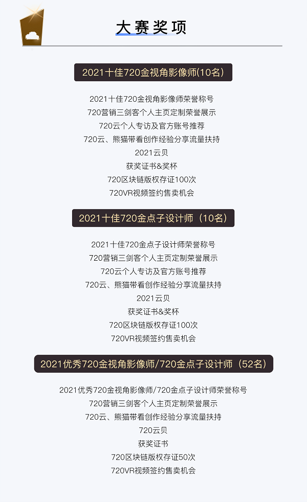 720金云獎(jiǎng)將評(píng)選72位影像師和設(shè)計(jì)師,授予“720金視角影像師”和“720金點(diǎn)子設(shè)計(jì)師”榮譽(yù)稱號(hào),同時(shí)選拔十佳720金視角影像師和十佳720金點(diǎn)子設(shè)計(jì)師,獲獎(jiǎng)?wù)邔@得以下獎(jiǎng)勵(lì):