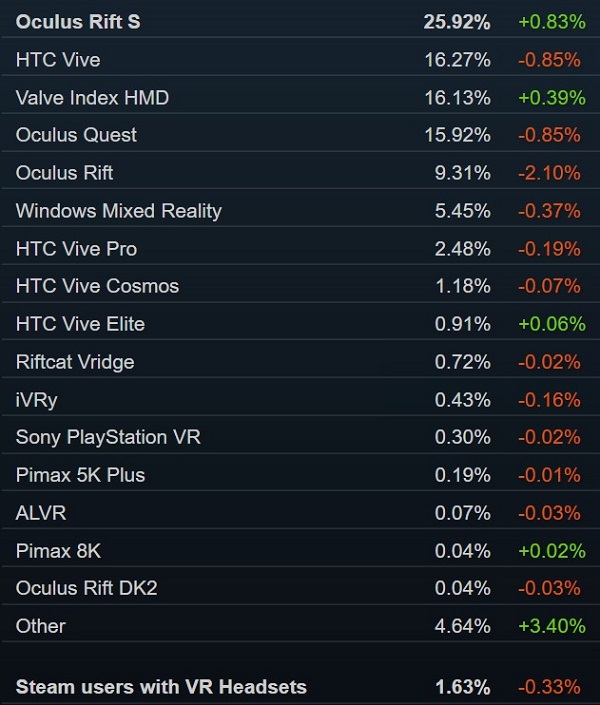 2020年12月Steam硬件和軟件調(diào)查報(bào)告顯示,VR用戶在Steam平臺(tái)總用戶中的最新占比為1.63%(-0.33%)。幾大陣營(yíng)方面,Oculus雖份額略有下滑,但依然占據(jù)了半壁江山(51.19%,-2.15%);HTC勉強(qiáng)保住了老二的位置,但在新老競(jìng)爭(zhēng)對(duì)手的夾擊下,份額即將跌破20%(20.84%,-1.05%);Valve Index(16.13%,+0.39%)實(shí)現(xiàn)了對(duì)Quest的反超,重新回到前三。