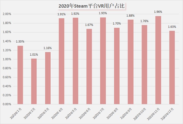 根據(jù)我們統(tǒng)計(jì)的2020年Steam平臺(tái)VR用戶占比(上圖),1.63%確實(shí)創(chuàng)下了4月份以來(lái)的新低,但如果環(huán)比2019年12月(1.09%),依然有很大幅度的增長(zhǎng)。根據(jù)Valve日前發(fā)布的統(tǒng)計(jì)數(shù)據(jù),2020年Steam平臺(tái)全球月活用戶達(dá)到1.204億,照此估算,2020年12月Steam平臺(tái)的VR月活用戶人數(shù)約為204.68萬(wàn)。