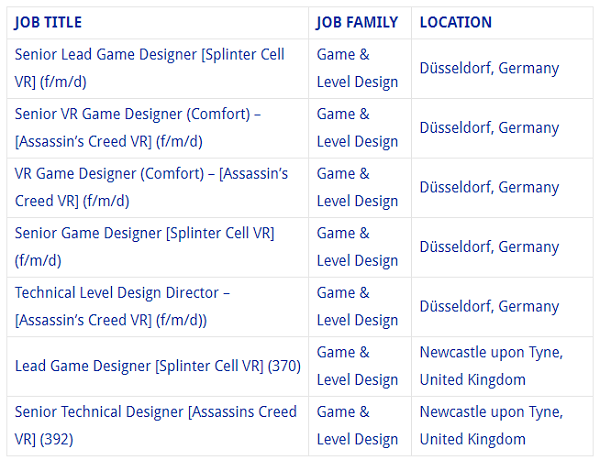 種種跡象表明,育碧將在「細(xì)胞分裂VR」上為玩家?guī)矶嗳擞螒蝮w驗(yàn),但PC VR不會(huì)是游戲的唯一目標(biāo)平臺(tái),在整個(gè)Oculus平臺(tái)上同時(shí)支持PC VR與Quest 2可能性非常大。目前育碧尚未透露任何關(guān)于「刺客信條VR」以及「細(xì)胞分裂VR」發(fā)行日期的相關(guān)消息,完整的職位招聘列表如下: