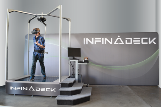 Infinadeck:世界首臺(tái)萬(wàn)向跑步機(jī),用戶戴上VR頭顯后就可以朝任何方向走動(dòng)或跑動(dòng)。Infinadeck配備了電機(jī)和連接到傳感器的跑道,可以追蹤用戶的運(yùn)動(dòng)。其中,一整條沿Y軸運(yùn)動(dòng)的大皮帶輪,帶動(dòng)多條沿X軸運(yùn)動(dòng)的小皮帶輪,可以識(shí)別和記錄玩家在兩個(gè)軸向上的運(yùn)動(dòng),幫助用戶在虛擬世界中自由活動(dòng),這比Virtuix Omni的運(yùn)動(dòng)控制體驗(yàn)要舒服很多。