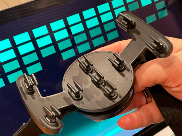 當(dāng)我(指Scott Stein,下文同)戴上Oculus Quest VR頭顯,我發(fā)現(xiàn)自己身處一間滿是大腦袋外星人的房間里,這些外星人的腦袋不斷閃爍著白光。我轉(zhuǎn)向其中一個外星人,注視著它,很快它的腦袋就發(fā)生了爆炸。我又嘗試著注視其他外星人,以同樣的方式消滅了它們。最后我看向一個閃爍的傳送標(biāo)記,并成功通過它穿越了整個房間。這一切聽起來很像是眼動追蹤的功能,但實際上我并沒有使用任何眼動追蹤設(shè)備,而是使用了位于頭后部帶有電極能夠追蹤大腦視覺皮層的頭帶完成的。