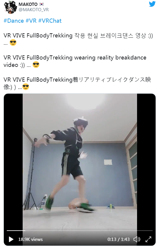 ▲為了實現在虛擬現實中完成全身舞蹈動作,來自韓國的VRChat舞者Makoto采用了HTC Vive+Index手柄+Vive Trackers運動追蹤器的全身動捕追蹤解決方案