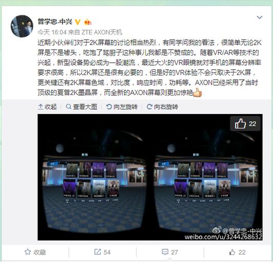 今年一直被各路人稱為VR元年,如果使用手機(jī)搭配Cardboard體驗(yàn)VR的話,手機(jī)沒有2K屏幕的話會(huì)大幅降低體驗(yàn)感受。曾學(xué)忠也發(fā)表了他對(duì)于VR產(chǎn)品的理解,并且配了一張VR顯示畫面的圖片,看來中興極有可能在Axon天機(jī)2發(fā)布時(shí)同時(shí)帶來首款VR產(chǎn)品。“好的VR體驗(yàn)不會(huì)只取決于2K屏,更關(guān)鍵還有2K屏幕色域,對(duì)比度,響應(yīng)時(shí)間,功耗等。”從這句話表達(dá)的意思,我們似乎可以推測(cè),中興VR在上述羅列的因素上都表現(xiàn)不俗。如果事實(shí)果真如此,那么中興VR在體驗(yàn)上應(yīng)該會(huì)表現(xiàn)出色。