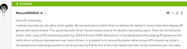 近日,Manuel Guzman在NVIDIA社區(qū)發(fā)貼透露團隊正在開發(fā)一個顯卡驅(qū)動熱修復(fù)補丁,以解決使用最新顯卡驅(qū)動的用戶在體驗VR游戲時發(fā)生的異常幀數(shù)峰值問題。雖然目前用戶在游玩VR游戲時后臺GPU監(jiān)控程序(例如EVGA Precision X / MSI Afterburner)仍會偶爾觸發(fā)卡頓現(xiàn)象,但該修復(fù)補丁已針對上述問題進行了改進。