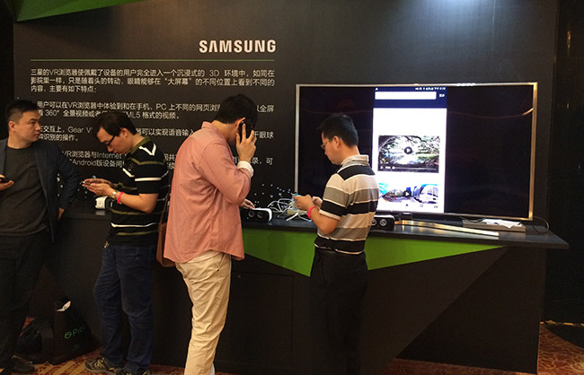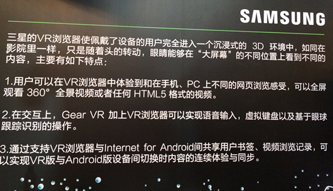 三星當(dāng)天并沒有設(shè)立大型展臺(tái),一個(gè)3*3左右的展臺(tái),幾臺(tái)Gear vr,一臺(tái)三星電視就是全部家當(dāng)。開始記者以為三星只是簡單的讓大家體驗(yàn)下Gear vr搭配新手機(jī)S7的效果,結(jié)果記者實(shí)在是太Naive了。三星當(dāng)天展示的是自己的瀏覽器Sumsang Internet,配合Gear VR來進(jìn)行上網(wǎng)、觀看360視頻等功能。