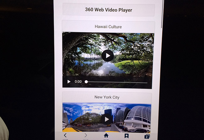 在展示的手機(jī)中,有一個(gè)三星特別制作的頁面,叫做360 Web Video Player,上面有幾個(gè)Felix&Paul等知名公司制作的全景視頻。與普通網(wǎng)頁一樣,打開這個(gè)頁面將手機(jī)插入Gear VR,用戶就可以自由選擇想要看的360視頻,點(diǎn)擊全屏模式之后,就能達(dá)到像使用Milk VR或者Oculus 360 Video看360視頻一樣的效果!