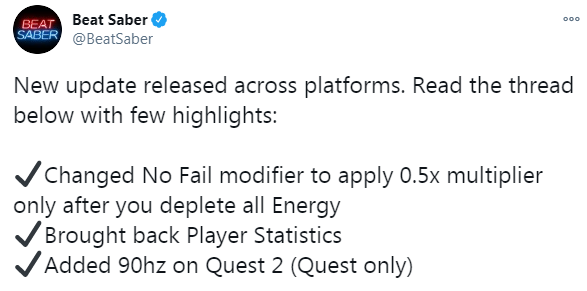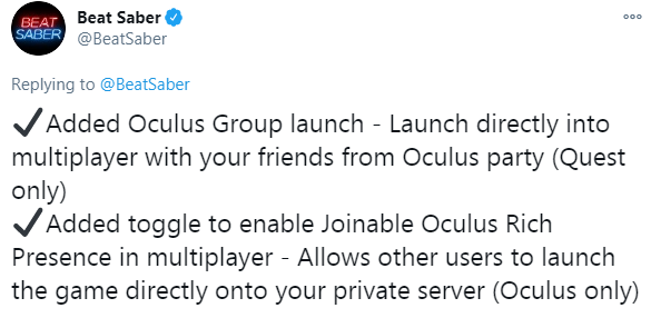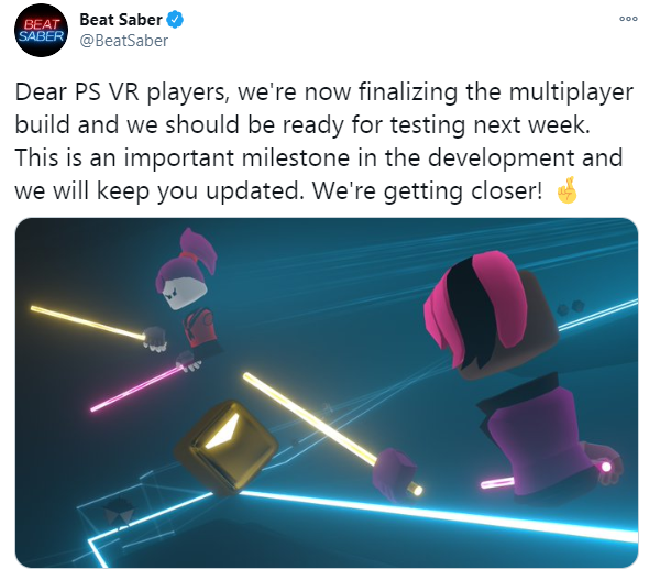 除此之外,Beat Games官方推特還發(fā)布推文:“親愛的PSVR玩家,我們正在完善「Beat Saber」多人游戲模式,并將于下周對(duì)該模式進(jìn)行測(cè)試,推出多人模式將是我們開發(fā)歷程中重要的里程碑,而這一天即將到來!”