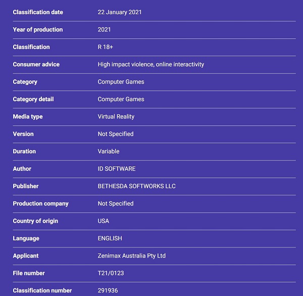 1月22日,澳大利亞游戲評級機構通過了由id Software提交的游戲《PROJECT 2021A》評級。評級信息顯示這款游戲是一款VR游戲,并且有“很高的暴力成分”(18+),支持“聯(lián)機交互”。