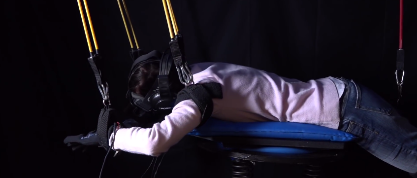 由MIT的Dhruv Jain創(chuàng)造的這款模擬器把虛擬現(xiàn)實和懸浮挽具結(jié)合在一起, 來營造一種水下潛泳的感覺。