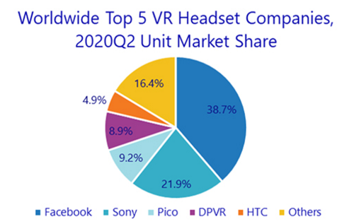 目前,F(xiàn)acebook旗下VR一體機Quest的出貨量全球第一。根據IDC報告,2020年Q2全球VR頭顯出貨量中,F(xiàn)acebook占據38.7%的份額,排在第二的是索尼(21.9%),排在第三的是Pico(9.2%),排在第四的是大朋VR(8.9%),排在第五的是HTC(4.9%)。