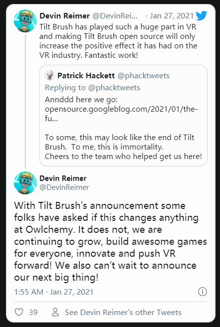 谷歌旗下還擁有另一家VR工作室Owlchemy Labs,該工作室開發(fā)了「Job Simulator」和「Vocation Simulator」。Owlchemy Labs工作室的負(fù)責(zé)人Devin Reimer在推特上則表明谷歌仍將繼續(xù)推進VR游戲相關(guān)的研發(fā)工作,并即將有一些重要的消息對外宣布。