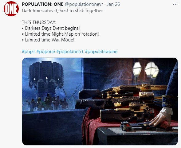 據(jù)外媒UploadVR報(bào)道,近日,由美國游戲工作室BigBox VR開發(fā)的VR“吃雞”游戲「Population: One」開啟“Darkest Days”活動(dòng),該活動(dòng)將持續(xù)至2月7日。