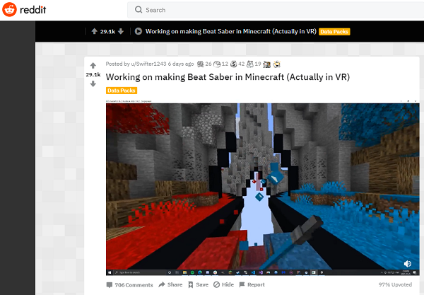 據(jù)外媒VRScout報道,近日,Reddit用戶u/Swifter1243發(fā)布一則「我的世界」游戲新玩法討論貼,從該貼子我們可以看出該玩家通過自制MOD實現(xiàn)在「我的世界」里玩「Beat Saber」。