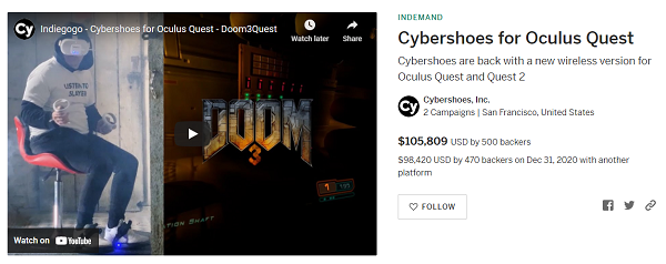 據(jù)外媒VRFocus報(bào)道,近日,奧地利VR外設(shè)廠商Cybershoes啟動(dòng)了“Cybershoes Quest套件+DOOM 3”Indiegogo眾籌。