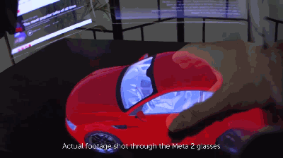 說到Meta,說它是第一款真正意義上的增強(qiáng)現(xiàn)實(shí)(AR)設(shè)備并不為過,可惜最終結(jié)局卻令人唏噓。Meta眼鏡里內(nèi)置了一臺愛普生微型3D投影儀,可將虛擬畫面投射到鏡片上。同時(shí)眼鏡上方放置了3D攝像頭,能夠捕捉用戶的手勢,根據(jù)手勢做出操控反應(yīng),精確度可精確至手指,可以直接通過手勢如抓握,來控制眼前的3D模型。此后,Meta又開發(fā)出了一些新手勢的識別,包括點(diǎn)擊、雙手旋轉(zhuǎn)、擴(kuò)大和縮小,但似乎主要是針對3D圖形的創(chuàng)建和編輯工具。