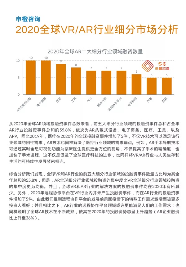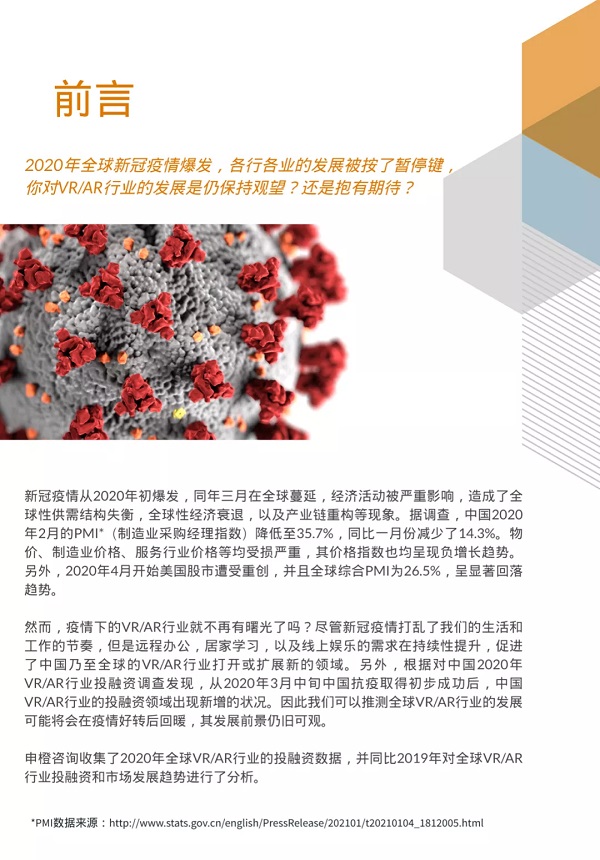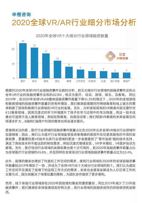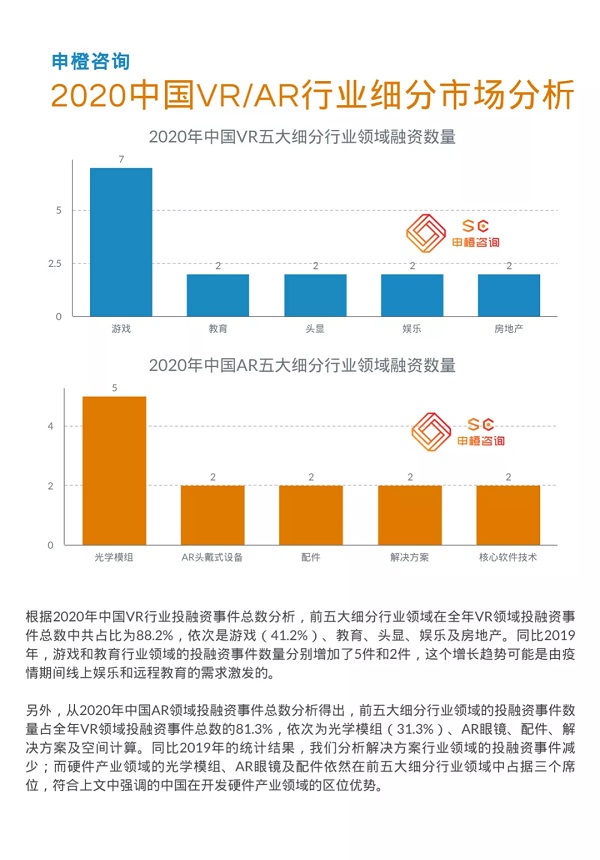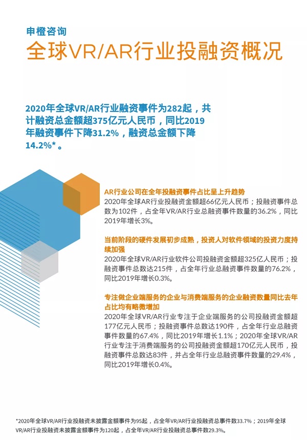 2020年疫情爆發(fā)并在全球蔓延后,同比2019年,2020年全球VR/AR行業(yè)的投融資事件數(shù)量從410件減少至282件,尤其是線下體驗行業(yè)領域遭受了重創(chuàng)。然而疫情對VR/AR行業(yè)是挑戰(zhàn)也是機遇,疫情期間對網(wǎng)絡教育,線上娛樂和虛擬工作空間的需求刺激了VR/AR在這些領域的發(fā)展,這些應用很大程度上改變了人們的生活和工作方式。