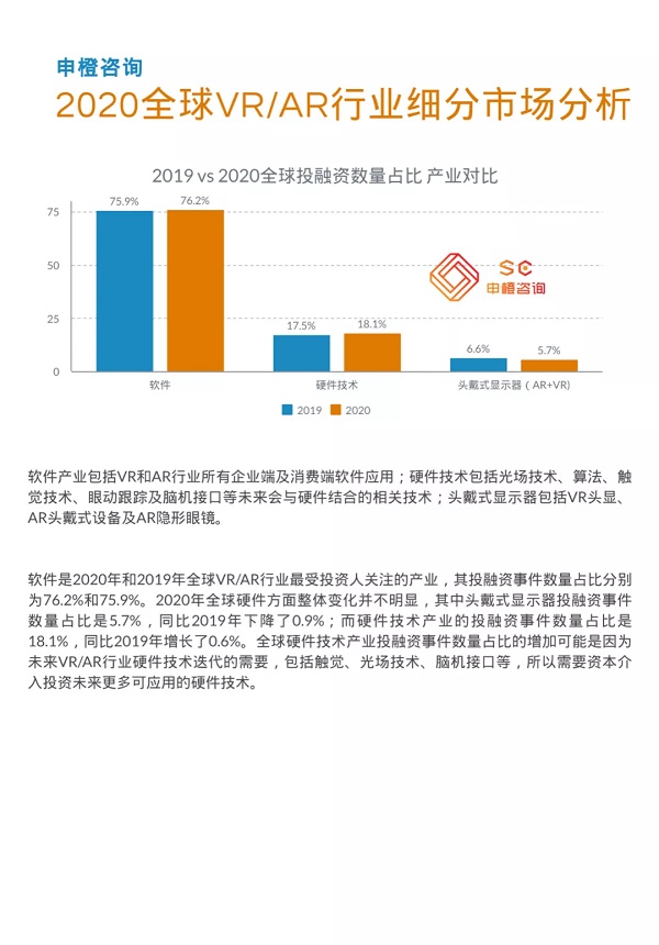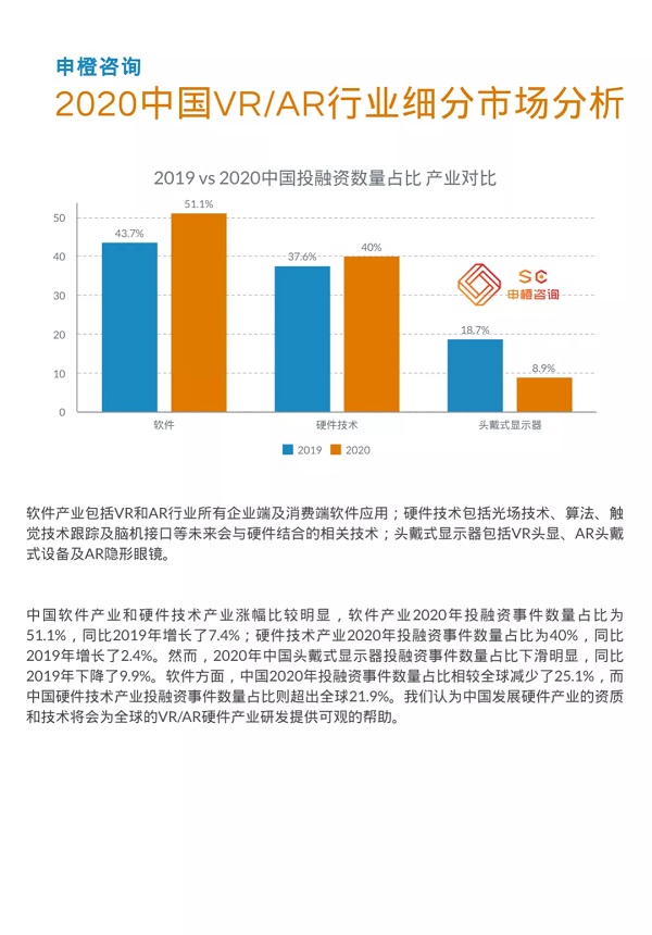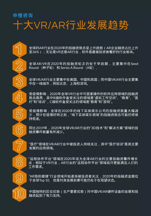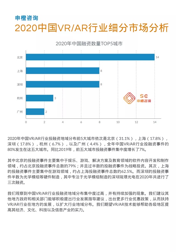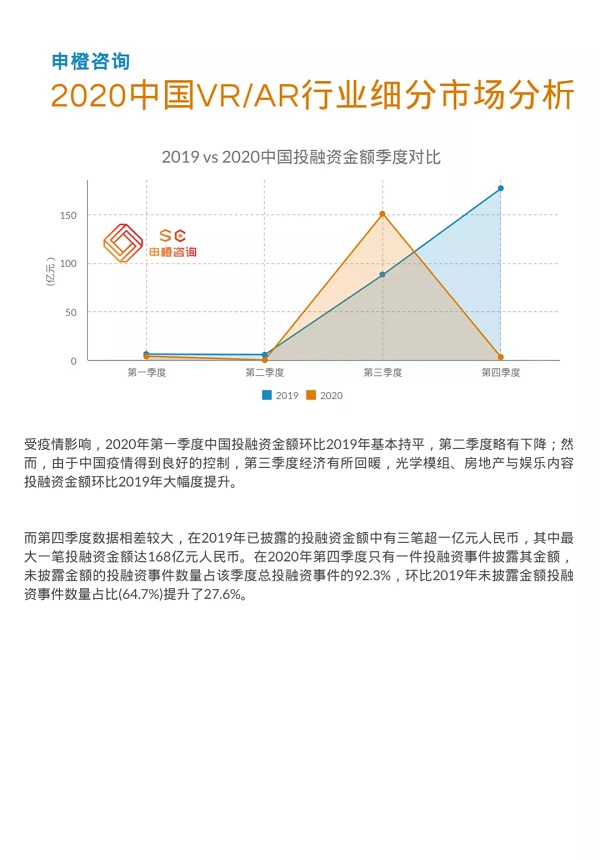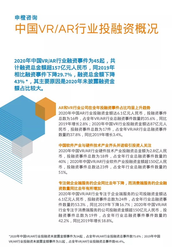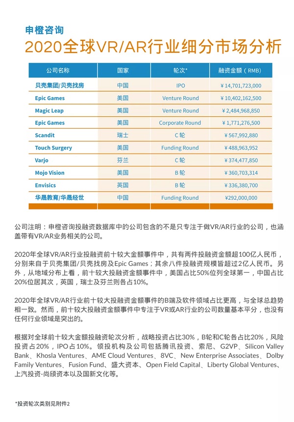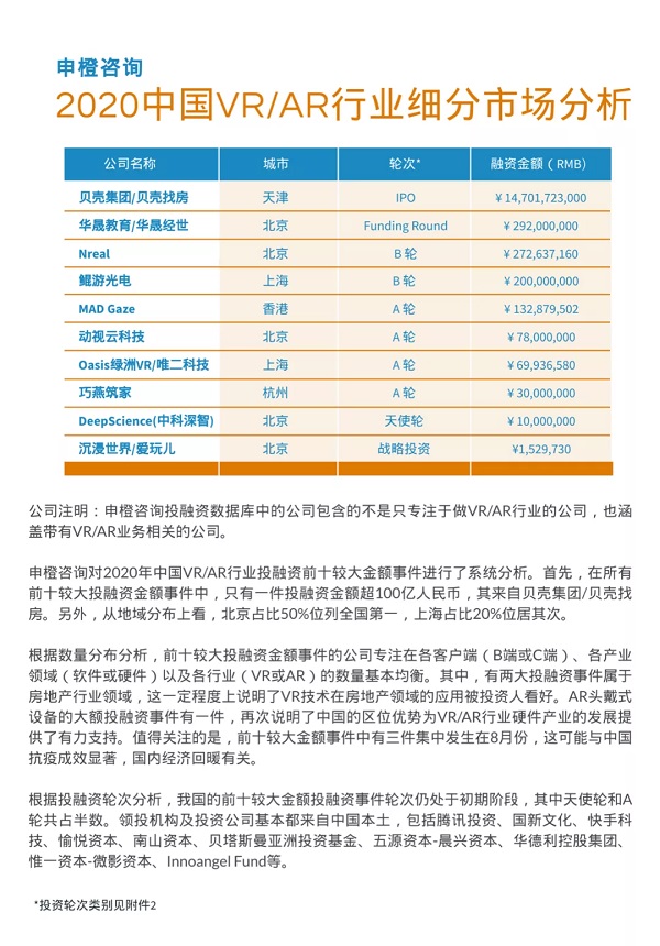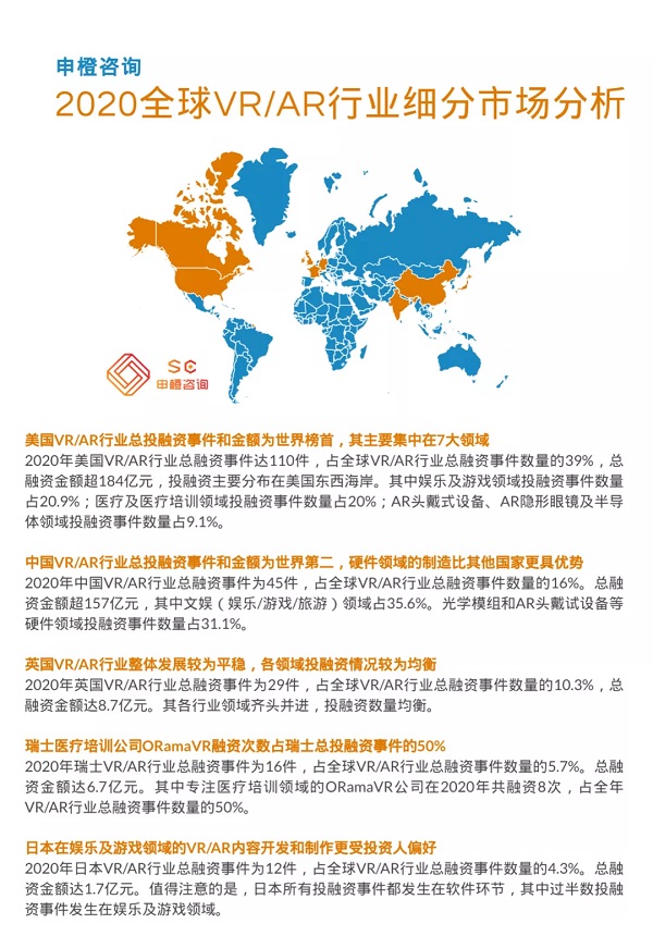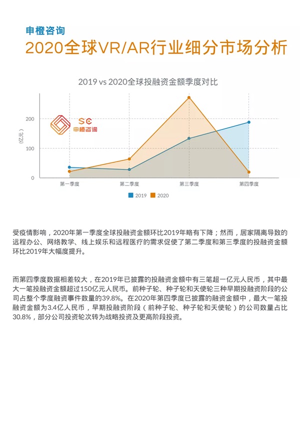 近日,中國VR/AR市場研究分析機構申橙咨詢發(fā)布了2020年VR/AR投融資報告《2020全球VR/AR行業(yè)投融資及市場發(fā)展趨勢》。報告指出,2020年虛擬現(xiàn)實和增強現(xiàn)實初創(chuàng)公司融資總金額高達375億元人民幣,其中中國VR/AR投融資金額高達157.9億元人民幣,僅次于美國位列世界第二。2020年中國VR/AR硬件技術產(chǎn)業(yè)投融資數(shù)量占比為40%,超出全球21.9%。對此,申橙咨詢CEO岳里解釋說:“中國發(fā)展VR/AR硬件產(chǎn)業(yè)的資質(zhì)、能力和技術將會為全球的VR/AR硬件產(chǎn)業(yè)研發(fā)提供可觀的幫助?!?/div>