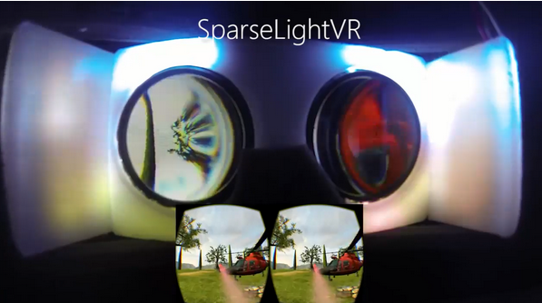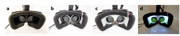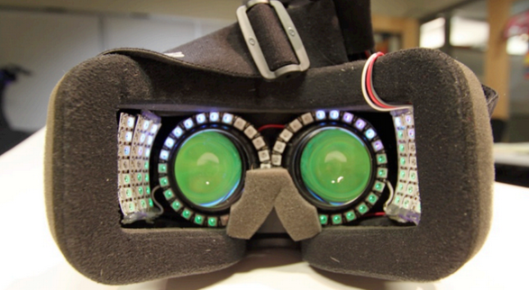 微軟研究院人機交互實驗室的研究院開發(fā)出一個系統(tǒng),在虛擬現(xiàn)實頭戴內部側面、透鏡周圍安裝廉價的LED陣列,來解決眩暈問題。實驗機型為Oculus Rift DK2開發(fā)者版,僅擁有90度視野(零售版本為110度),LED陣列由數(shù)個正方形的LED燈均勻構成,在運行游戲時常亮工作。