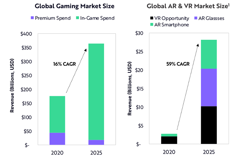 ARK認為,全球游戲市場將以16%的年復(fù)合增長率(CAGR)擴增,從2020年的1750億美元增至2025年的3650億美元;AR和VR市場將保持59%的年復(fù)合增長率,并從2020年的30億美元增至2025年的280億美元。