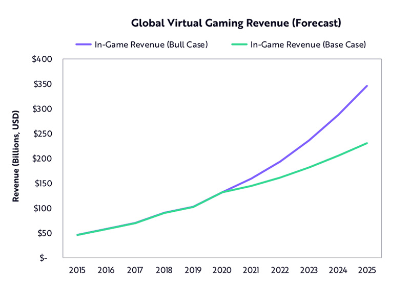 ARK認為,如果變現(xiàn)能力和投入時間的增長趨勢不變,游戲內(nèi)購收入將以21%的年復(fù)合增長率增加,并將從2020年的1300億美元增長至2025年的3500億美元。