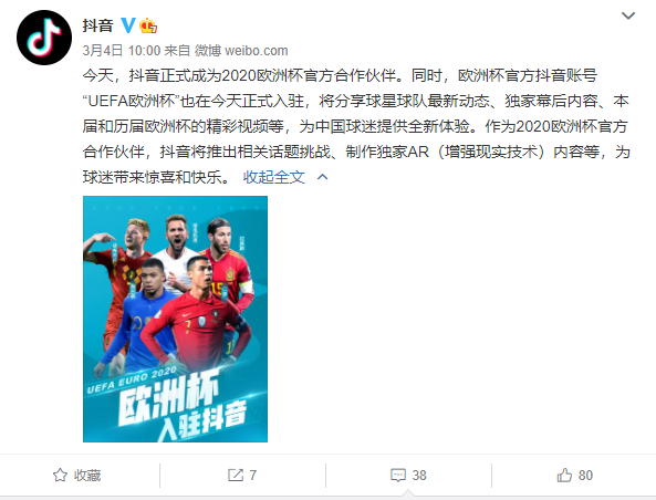 3月4日,趕在距開(kāi)幕整整100天之際,抖音通過(guò)官方微博宣布:正式成為“2020歐洲杯”官方合作伙伴。據(jù)悉,作為“2020歐洲杯”官方合作伙伴,抖音將在合作期間推出相關(guān)話題挑戰(zhàn)、制作獨(dú)家AR內(nèi)容等。