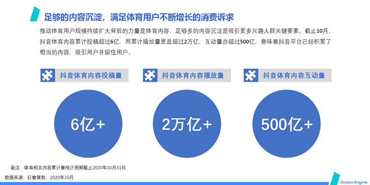 「2020抖音體育生態(tài)白皮書」顯示,截至2020年10月,抖音體育興趣用戶規(guī)模已超過(guò)3.5億,體育相關(guān)內(nèi)容創(chuàng)作者達(dá)到9800萬(wàn),創(chuàng)作體育相關(guān)內(nèi)容超過(guò)6億條,累計(jì)播放量超過(guò)2萬(wàn)億,互動(dòng)量超500億。
