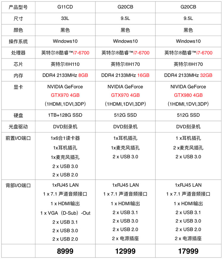 其中,G11CD 和 G20CB 入門款均搭載了 GTX 970,4GB 顯存,第六代酷睿 i7-6700;G20 高配版則配備了GTX 980,4GB 顯存,第六代酷睿 i7-6700 處理器。