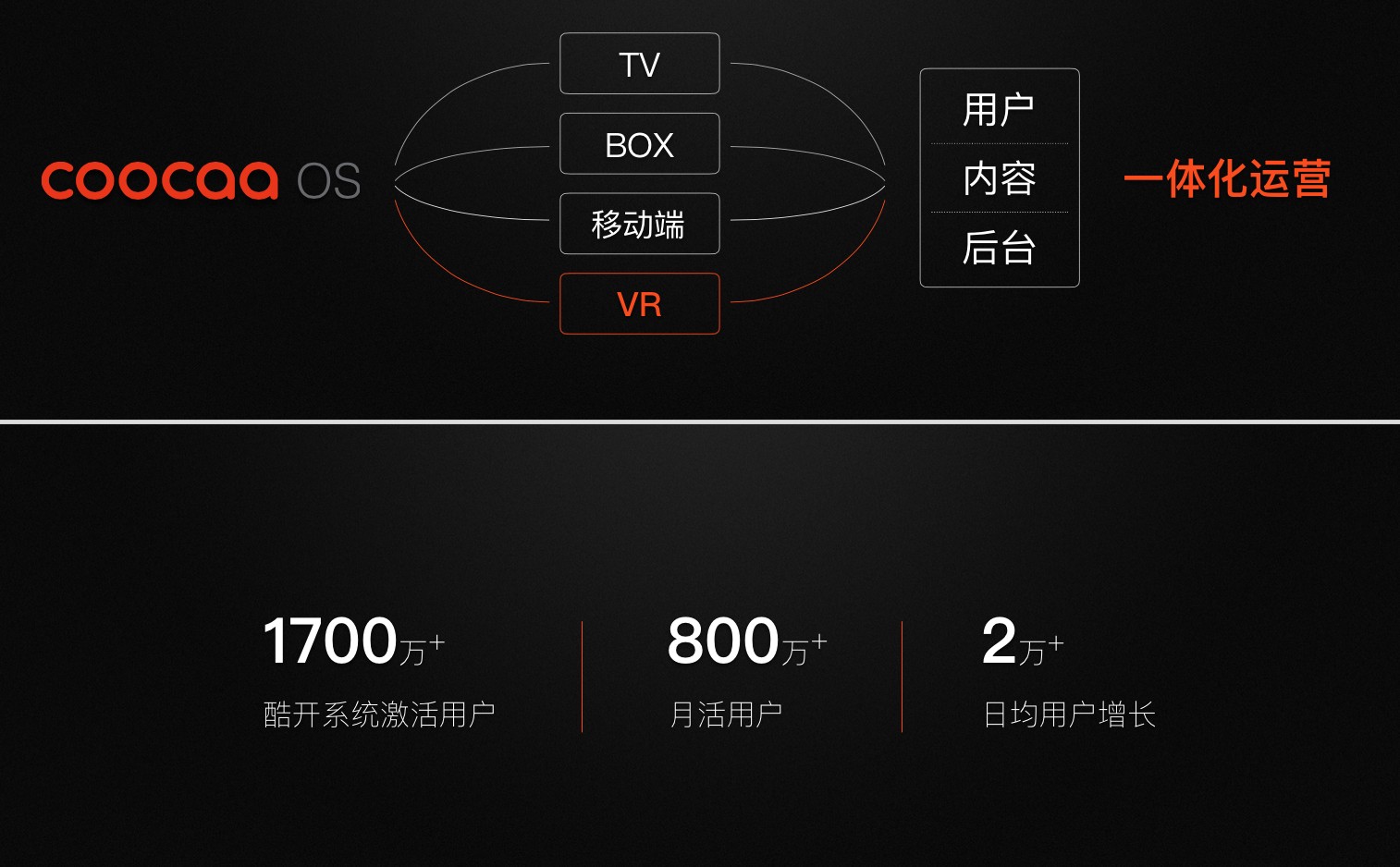 眾所周知,酷開(kāi)不只是一個(gè)電視機(jī)品牌,還是一家客廳娛樂(lè)顯示領(lǐng)域的平臺(tái)服務(wù)商,擁有強(qiáng)大的內(nèi)容運(yùn)營(yíng)能力,之前一直是以“智能電視操作系統(tǒng)-酷開(kāi)系統(tǒng)”為運(yùn)營(yíng)核心,覆蓋 TV、BOX、移動(dòng)端幾個(gè)分支,現(xiàn)在又延伸到VR。COCO在發(fā)布會(huì)上說(shuō)到:“新上線的酷開(kāi)系統(tǒng)VR版本,使得酷開(kāi)系統(tǒng)成為首個(gè)將大屏OTT系統(tǒng)和VR系統(tǒng)全面打通的全平臺(tái)系統(tǒng),實(shí)現(xiàn)了內(nèi)容、用戶、后臺(tái)的一體化融合及運(yùn)營(yíng)。”