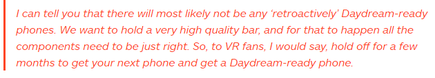 我可以告訴你目前市面上幾乎沒有可以完全支持Daydream的手機。我們想要保持一個較高的品質門檻,為了實現(xiàn)這一切,所有的組件都必須遵守Daydream的規(guī)范標準。所以對于VR粉絲來說,我可以這么說,再等幾個月入手你的下一臺安卓手機,買一太支持Daydream的手機。