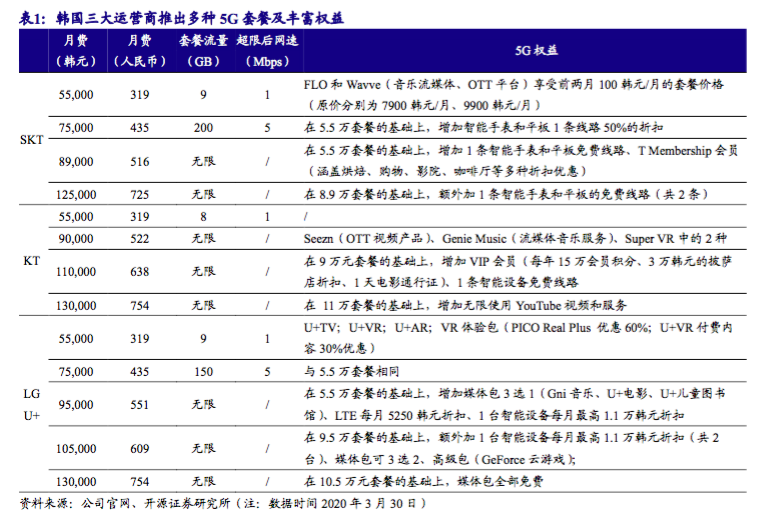 韓國三家運營商的5G套餐都是從55000韓元(約合人民幣315元)起步,但比較最低檔的套餐內(nèi)容,LG U+最能吸引5G用戶嘗鮮。
