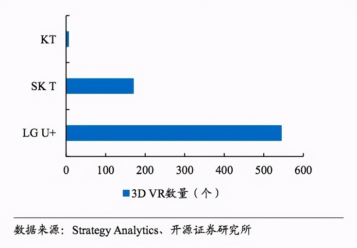 LG U+最初的VR總片源數(shù)在600部左右,兩年時間,已經(jīng)增加至4000多部。雖然另外兩家運營商也在布局VR,但都沒有LG U+“快、狠、準”。根據(jù)Strategy Analytics發(fā)布的報告,截至2019 年9月,LG U+的 3D VR 內(nèi)容已有544個,而SKT和KT則分別為170個和6個。